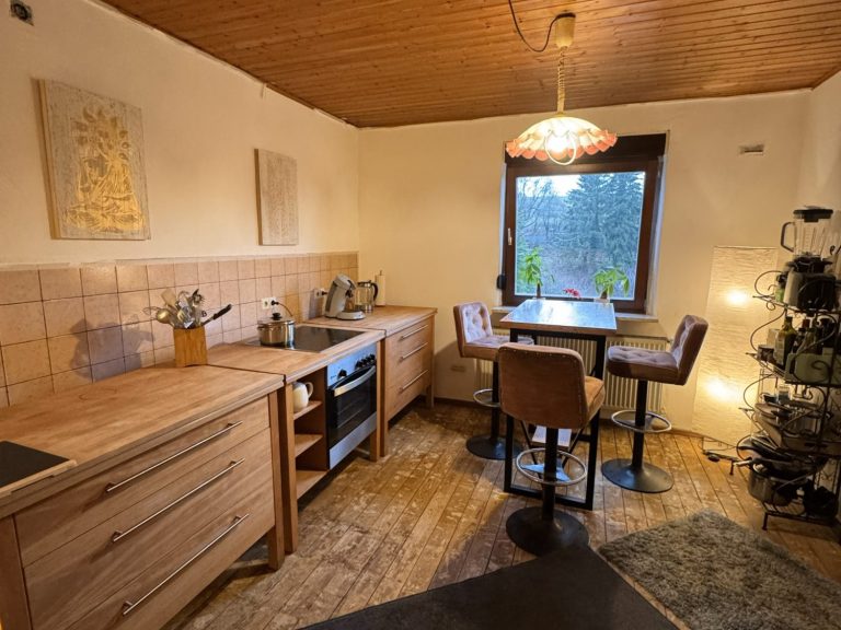 Die Küche bietet einen Zugang zur Diele und weiterführendem Zugang in das Kellergeschoss. Vom Fenster aus eröffnet sich der Blick auf die zum Haus gehörenden landwirtschaftlichen Flächen.